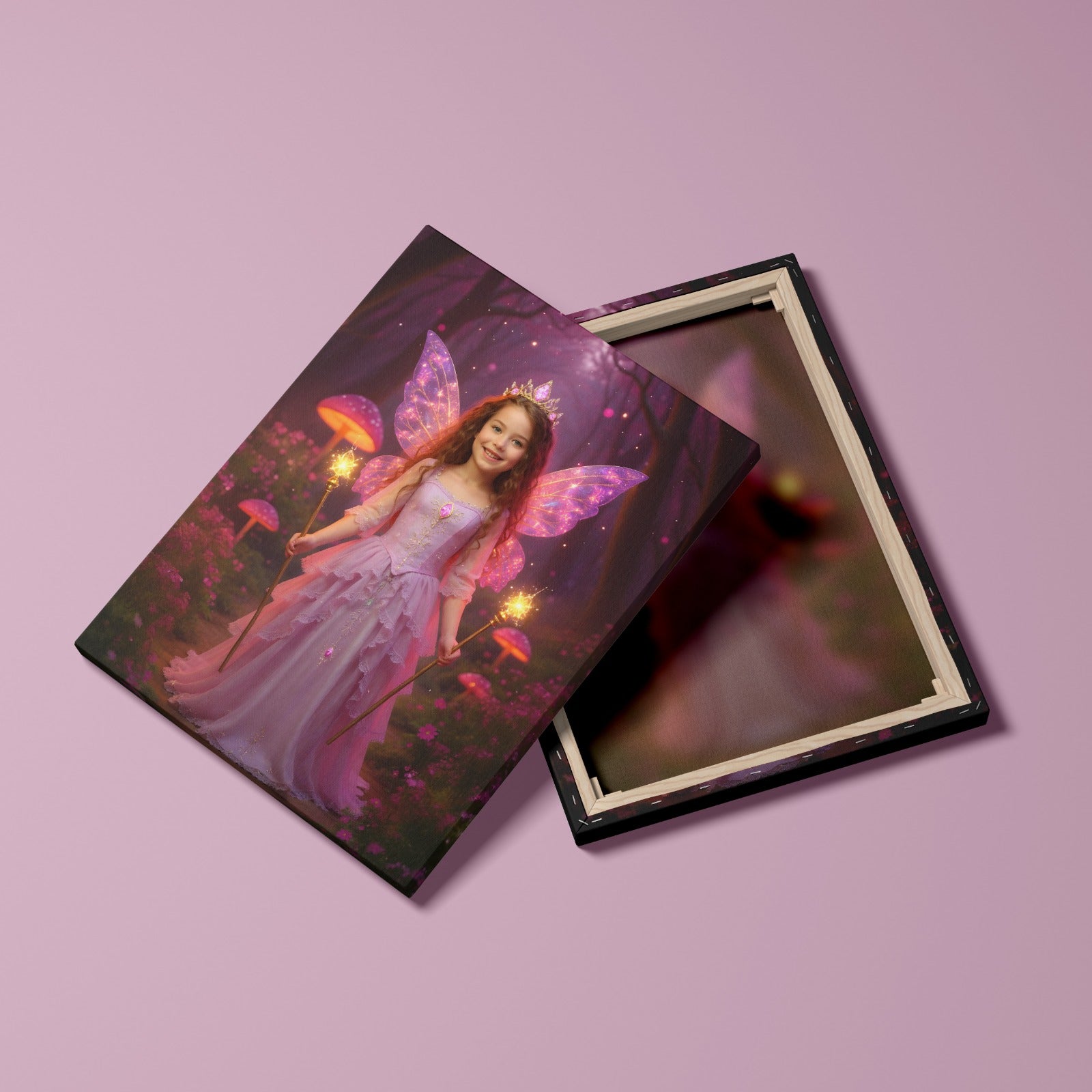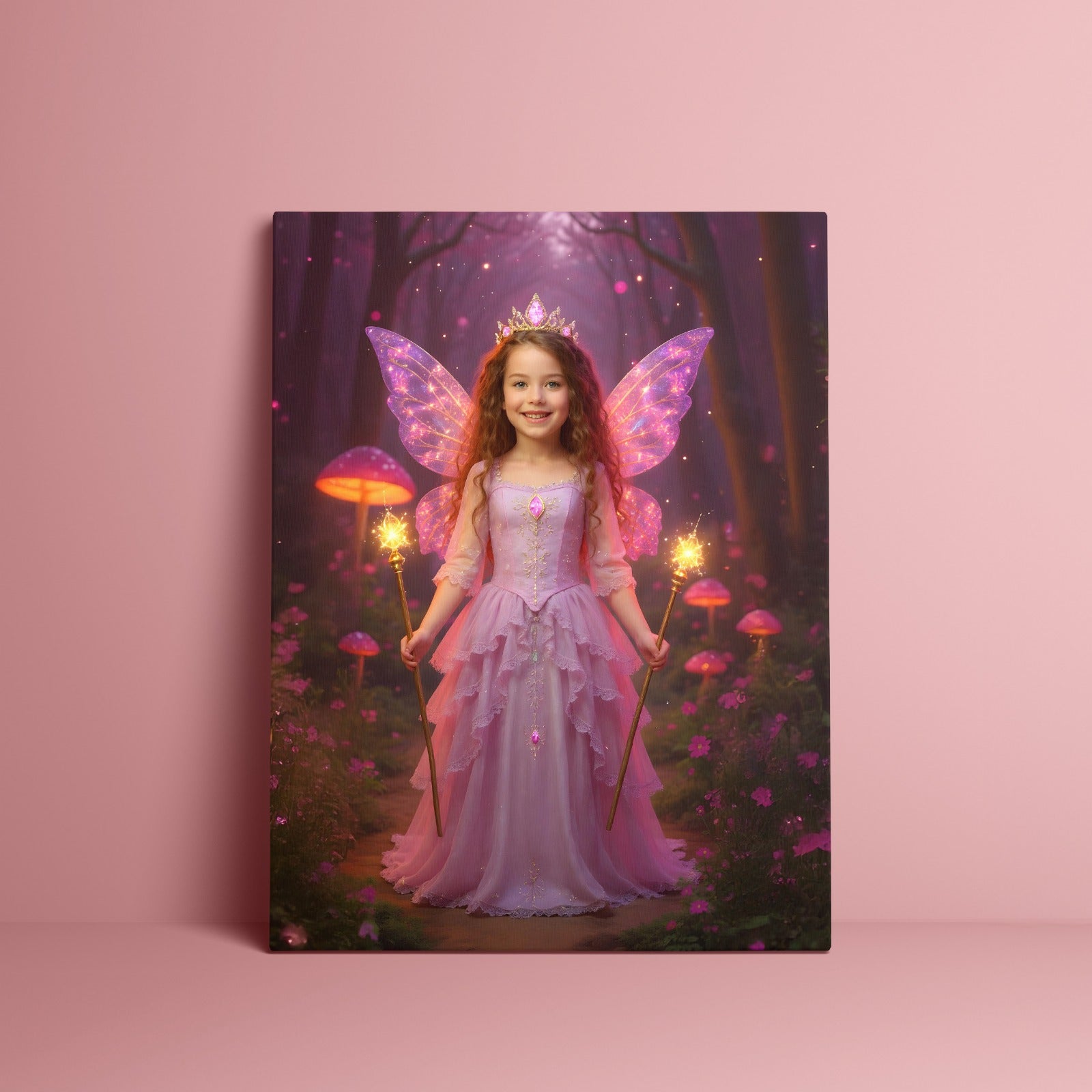 A glowing pink-winged fairy holding two sparklers in a violet forest. |