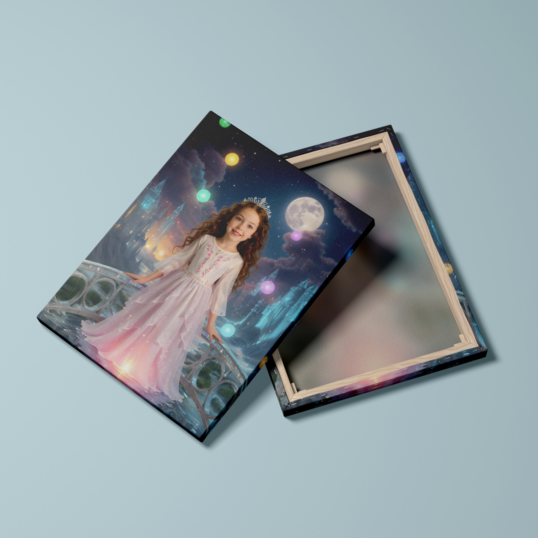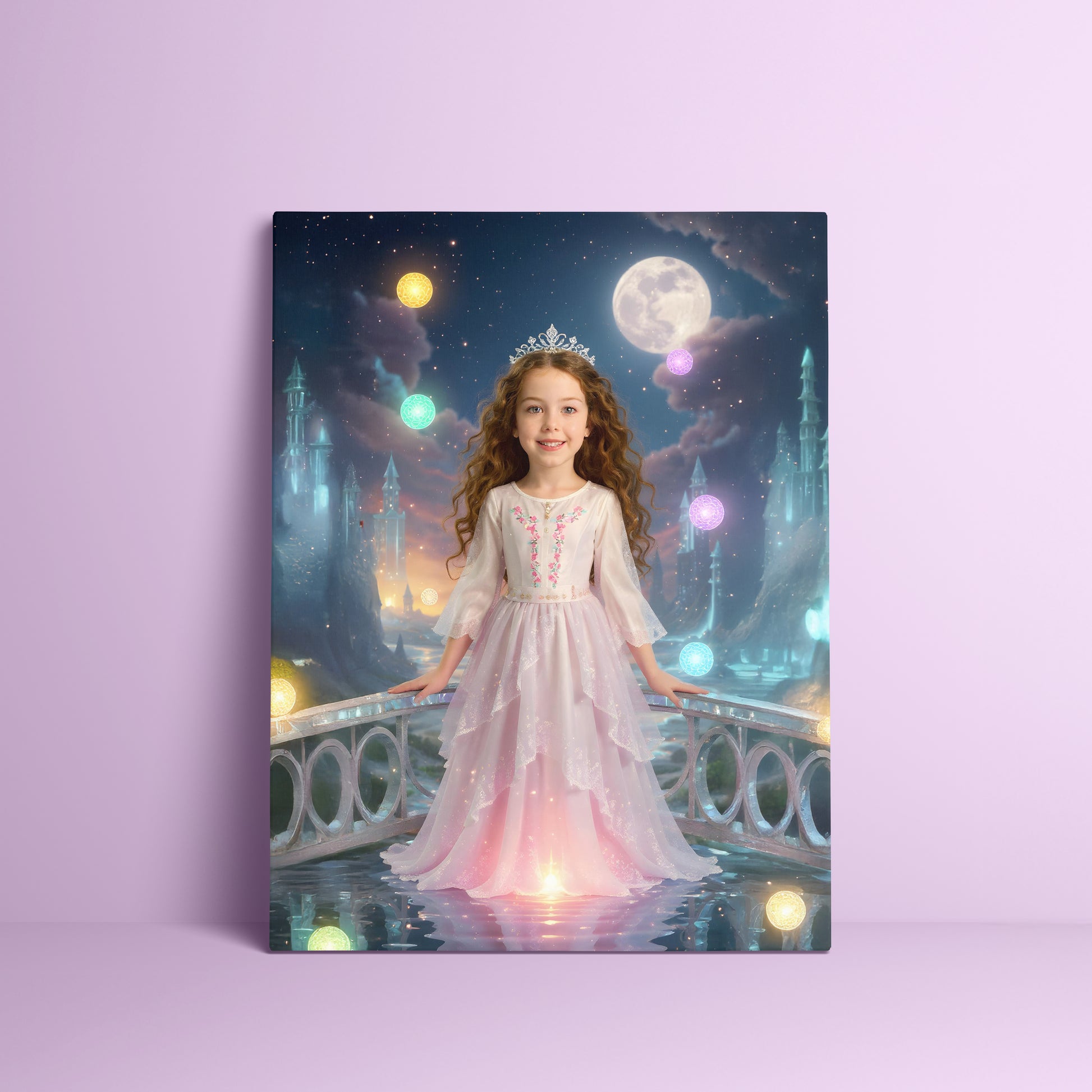 Princess in a sparkling silver gown seated against a cosmic sky.