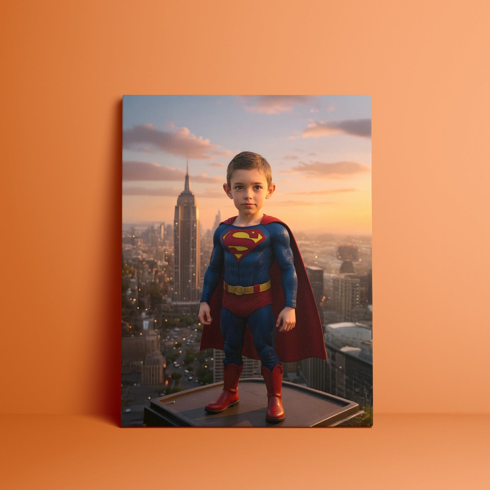 A brave young Superman standing tall above the city, ready to save the day.