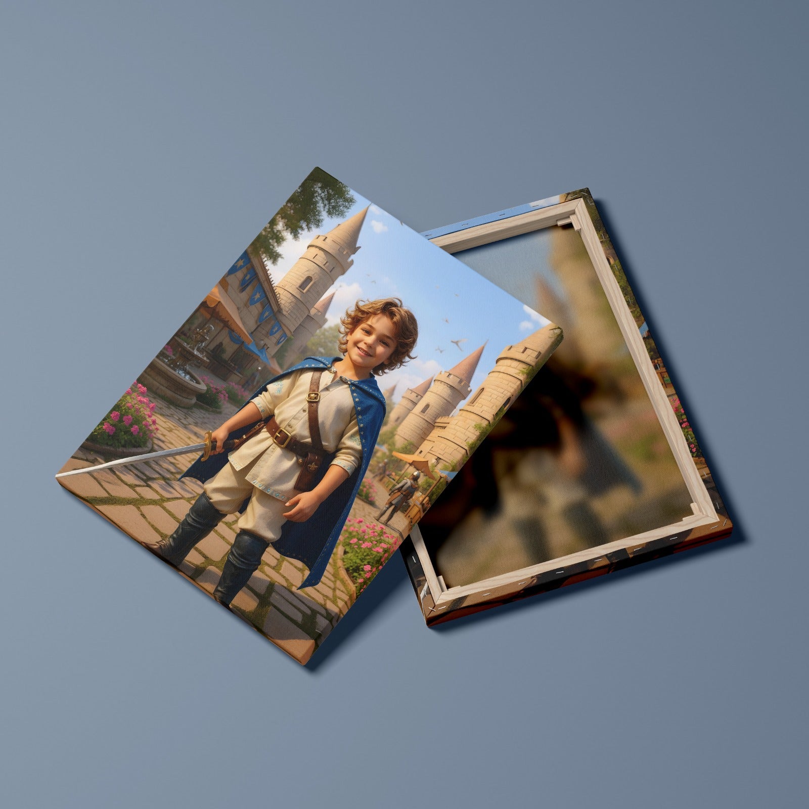 Brave boy with sword and blue cloak in a lively castle courtyard. |