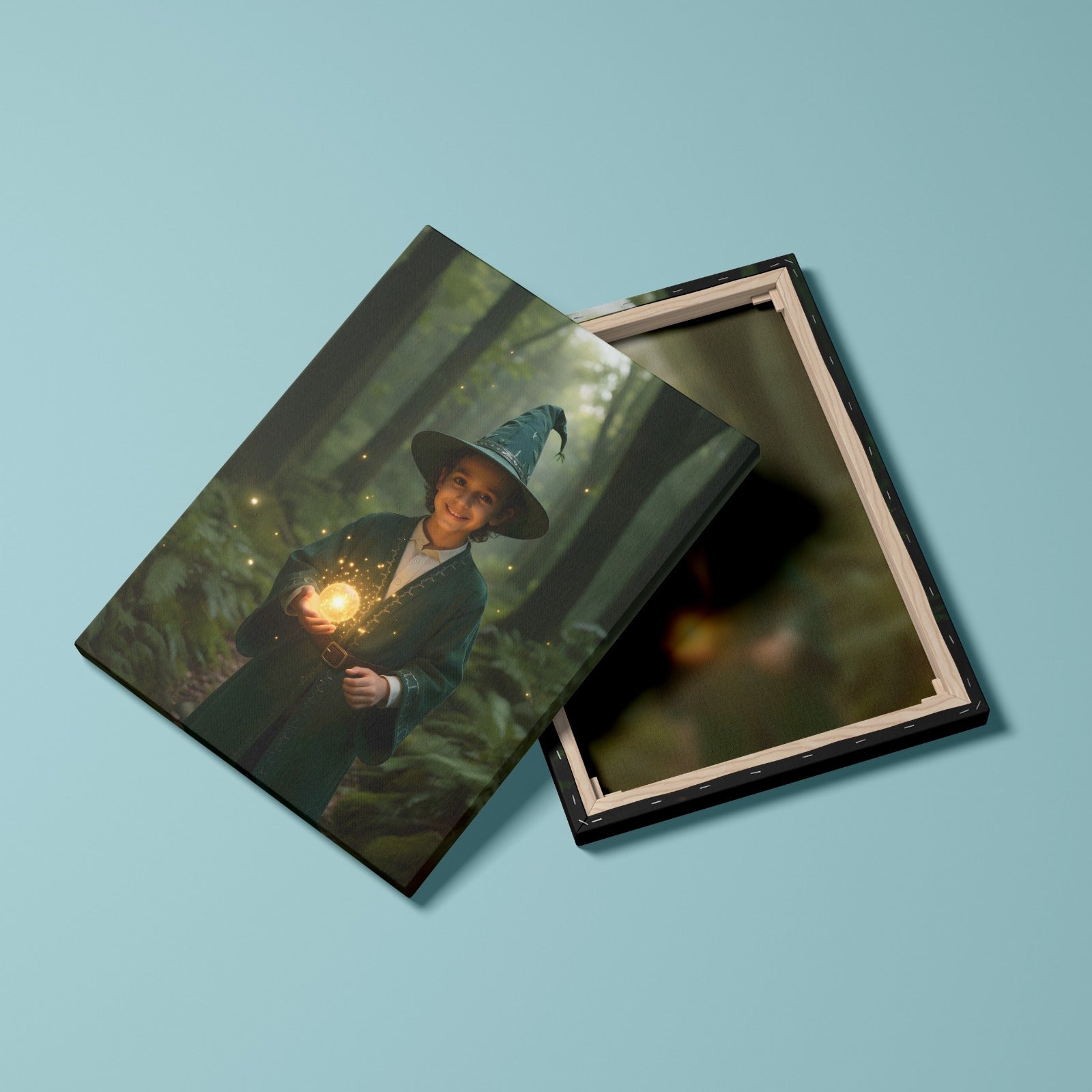 A smiling boy wizard holding a glowing orb of magic in the deep enchanted forest.